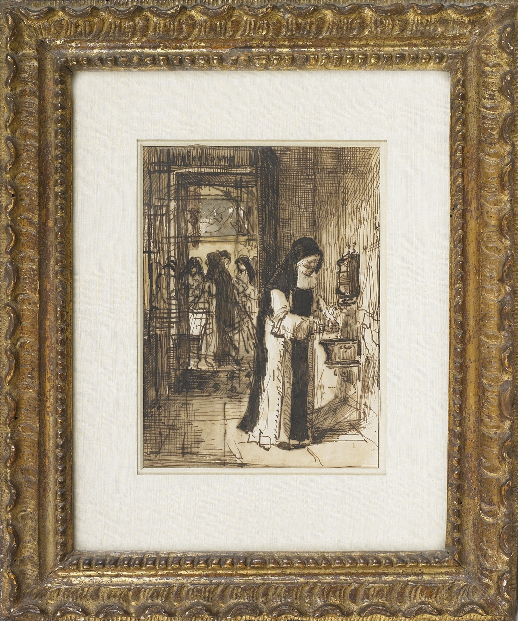 This heretofore unpublished drawing, with its emphatic hatching, shows us a young Sister washing her hands at a copper fountain at the entrance of the refectory. Her grey robe and black scapular indicate probably that she is one of the nuns from the Saint Germain hospital, a Sister of the Charity, one of the many we will see in his work…. In the background, the refectory is already crowded with Sisters, standing at their places, awaiting the graces. During this period, Bonvin often used a very particular ink-and-wash technique. The influence of the Dutch masters is very strong here, both in the technique and in the lines themselves; it is especially reminiscent of Rembrandt’s drawing and composition. Bonvin had been exploiting the device of allowing his viewer to glimpse another room since 1857; it is as a direct influence of the Northern schools. This is his own vision of art as an expression of the spiritual life, a vision of the soul painted with the aid of common ordinary subjects.