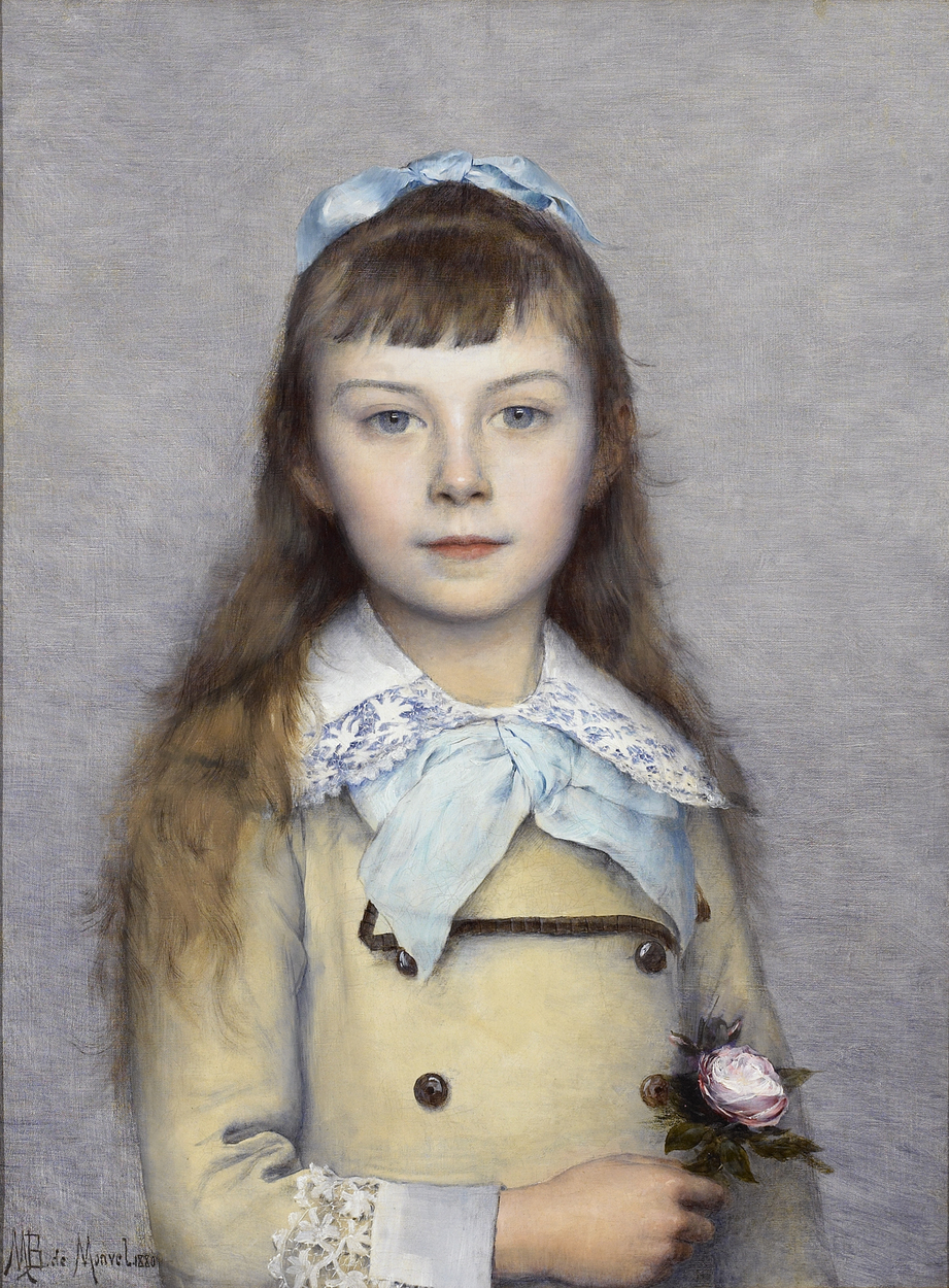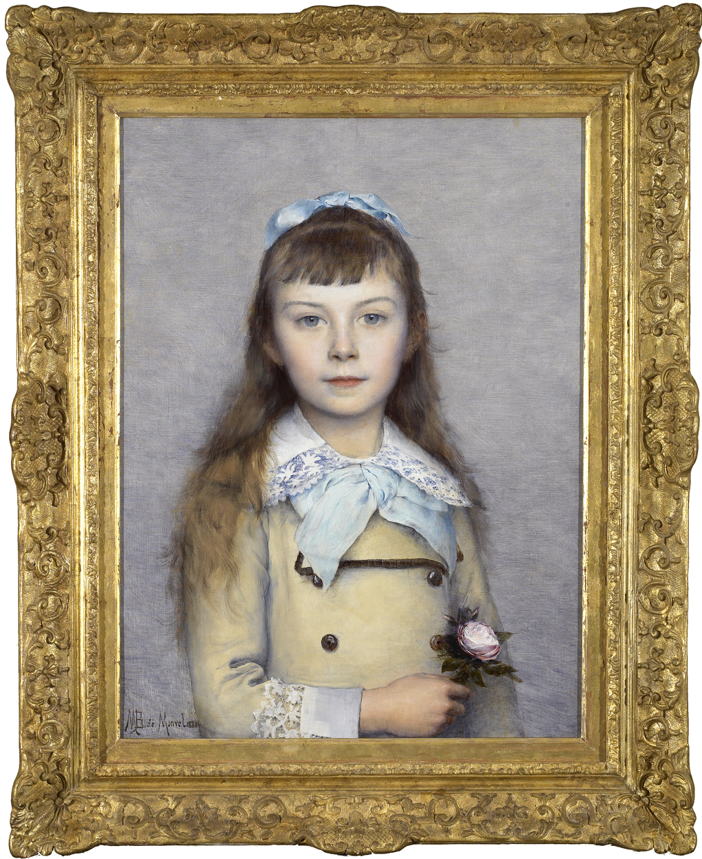 The present work is an exceptionally engaging portrait of young girl. Painted in 1880, the painting was created at the height of the Naturalist movement in France and at the birth of Symbolism and evokes both movements in its precision and intensity. The young sitter grasps a rose and looks intently at the viewer. The quiet curiosity of her expression, combined with the soft color and delicate brushwork of the piece gives it an interest that extends beyond mere portraiture. The girl’s confident stare recalls the focus of Jules Bastien-Lepage’s 1875 The Communicant, or of the intensity of Fernand Knopff’s 1885 Portrait of Jeanne Kéfer. Boutet de Monvel’s complementary pursuits of portraiture and illustration lead him to be a wonderful painter of children. A similar portrait of another young girl, Elizabeth Lasell, hangs in the collection of the Currier Museum of Art.