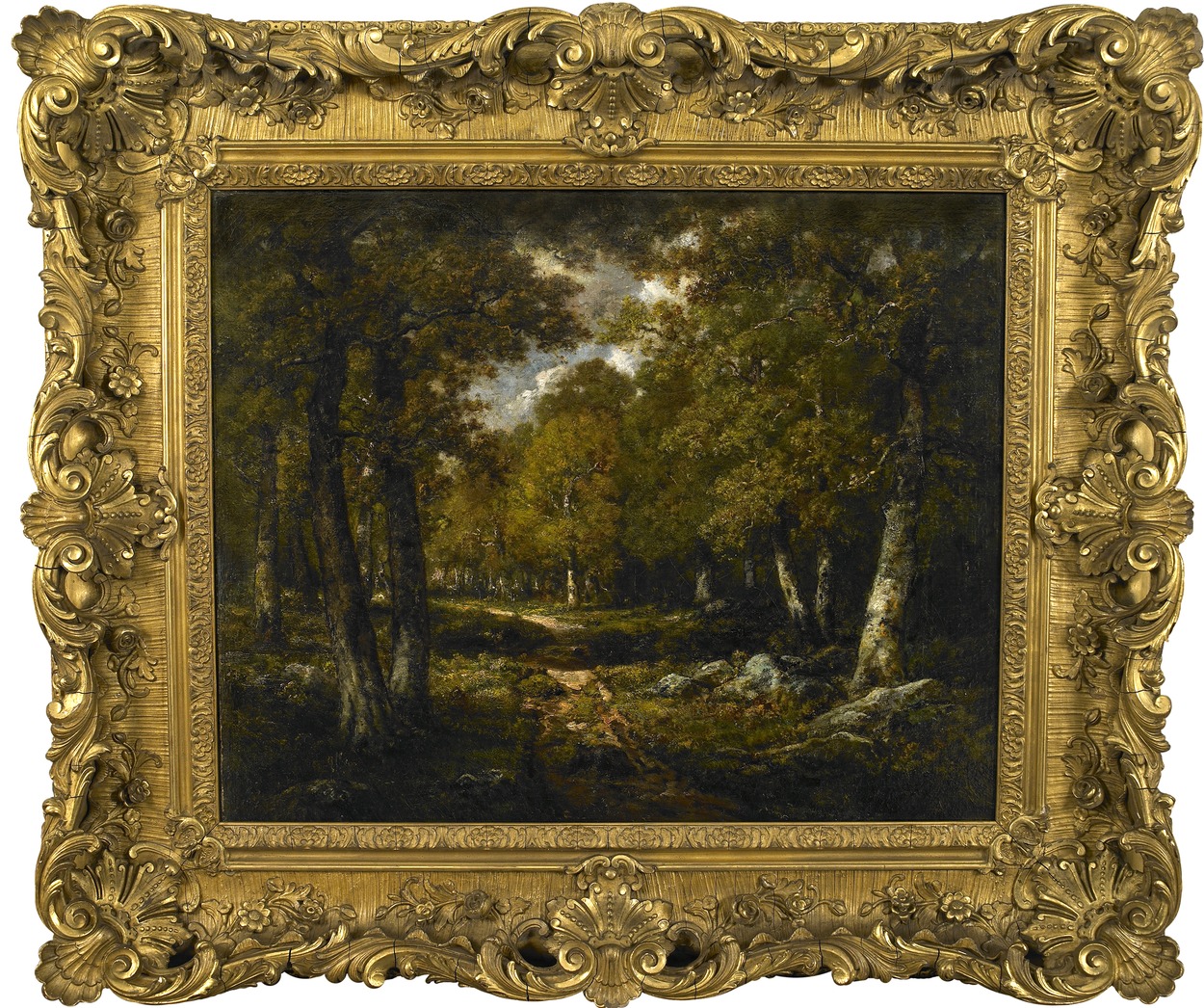 Though figure painting would always remain important for Diaz, it is his landscapes of the 1850s, 60s, and 70s, particularly those of Fontainebleau Forest, for which the artist is most remembered. Diaz met Theodore Rousseau in 1837 and showed his first Fontainebleau landscape at the Salon of that year. He began to exhibit pure landscapes without figures only after 1848, and the success of these forest interior scenes, including one which won him a first class medal at the Salon of 1848, allowed him to discontinue exhibiting publicly at the Salon after 1859. Recognized as a superb colorist in his own day, his forest interiors are richly painted with warm browns, oranges, golds and silvery tree trunks and branches. Though the artist often applied paint loosely with a broad palette knife, his acute observation of nature and natural effects was nevertheless keen. He was officially decorated even after leaving the official exhibition system when he received the Legion d’honneur in 1881. Diaz’s financial success enabled him to lend a helping hand to his friends when in need, including Troyon, Rousseau, and Millet.