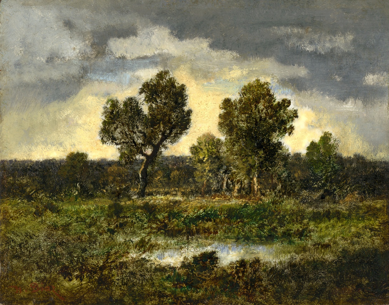 Though figure painting would always remain important for Diaz, it is his landscapes of the 1850s, 60s, and 70s, particularly those of Fontainebleau Forest, for which the artist is most remembered. Diaz met Theodore Rousseau in 1837 and showed his first Fontainebleau landscape at the Salon of that year. He began to exhibit pure landscapes without figures only after 1848, and the success of these forest interior scenes, including one which won him a first class medal at the Salon of 1848, allowed him to discontinue exhibiting publicly at the Salon after 1859. Recognized as a superb colorist in his own day, his forest interiors are richly painted with warm browns, oranges, golds and silvery tree trunks and branches. Though the artist often applied paint loosely with a broad palette knife, his acute observation of nature and natural effects was nevertheless keen. He was officially decorated even after leaving the official exhibition system when he received the Legion d’honneur in 1881. Diaz’s financial success enabled him to lend a helping hand to his friends when in need, including Troyon, Rousseau, and Millet.