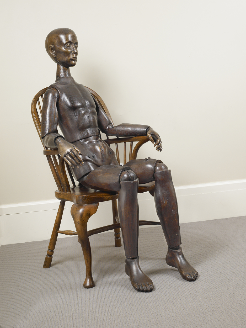These mannequins range in size from six inches to more than life-size, and served a variety of purposes. Early surviving sixteenth and seventeenth century wooden articulated figures were intricately carved to a high degree of finish and made to reflect the “perfect human form”. As a tool in the artist’s arsenal mannequins were hidden from view and rarely, if ever, included in representations of the artist’s studio. In the present model, hardwood has been beautifully planed and defines the musculature of the body, especially evident in the torso with its rib cage, clavicles and stomach muscles clearly rendered.
