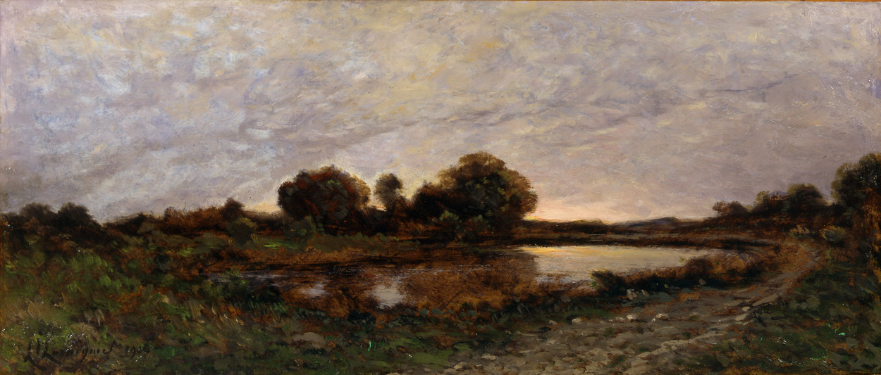 In 1852 Harpignies returned to France to establish his own studio in Paris and met the artists Jean-Léon Gérôme and Jean-Louis Hamon, both of whom were at the beginnings of their careers. A year later he moved outside of Paris to continue painting en plein-air, where he met Daubigny, Diaz, Dupré, Millet, and Rousseau – all first-generation members of the Barbizon school—to paint in the countryside near Fontainebleau Forest. In the early years of his career from 1853 through 1856, Harpignies, under the influence of Corot and of the Barbizon painter Constant Troyon, experimented with figural compositions, but very quickly he shifted his focus to pure landscapes. Harpignies made his Salon debut in 1853 and continued to exhibit regularly thereafter, winning medals in 1866, 1868, 1869, the Legion d’honneur in 1875, and the Grand Prix at the Exposition Universelle of 1900.