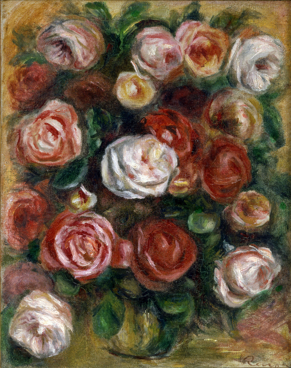 Renoir strove for the same qualities of spontaneity and naturalness in his still lifes that he did in his portraits. Working with vigorous brushwork and portraying the flowers in informal arrangements, he captures their living character. In Vase de Roses, a dynamic color effect is achieved by contrasting the cooler green tonality of the vase with the infinitely various warm tones of the of the bouquet. Academic tradition long held that floral still lifes were to be carefully arranged with an eye to achieving balanced harmonies, but Renoir’s compositions represent a radical break with this notion. As he explained, “When I have arranged a bouquet in order to paint it, I look at it from every angle and remain standing at the side I had not thought of” (quoted in G. Adriani, Renoir, exh. cat., 1999, p. 274).