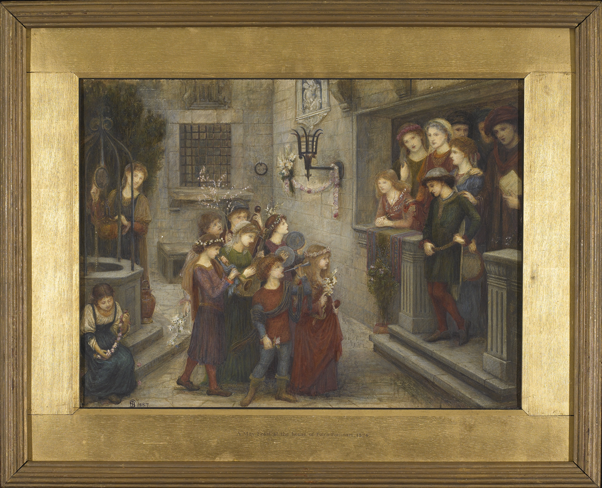 This work is one of three paintings that Spartali-Stillman sent to the Grosvenor Gallery in 1887, after her first full year of living in Rome. She was inspired by subjects from Dante and in 1887 painted four works in this vein. The current work depicts a May Day gathering at the home of the Florentine Banker Folco Portinari. Portinari was the father of Beatrice Portinari, who has been commonly identified as the Beatrice of Dante Alighieri’s Divine Comedy. According to Dante, he first met Beatrice when his father took him to the Portinari house for a May Day gathering, and it is likely that this is the gathering depicted in the present work. At the time of their meeting, Dante was eight years old, and Beatrice a year younger. Beatrice leans over the balustrade, a flowering branch in her hands, and the young Dante, dressed in a green tunic, stands next to her, his father’s hand resting on his shoulder. Dante was instantly taken with Beatrice, and remained so throughout her life. After Beatrice’s death in 1290, at the age of 24, Dante withdrew into study and began composing poems dedicated to her memory. The collection of these poems, along with others that he had previously written about her became Dante’s La Vita Nuova. The present work was painted as a pair to Spartali Stillman’s Upon a day came sorrow unto Me, a scene depicting Dante in his study on the day of Beatrice’s death.