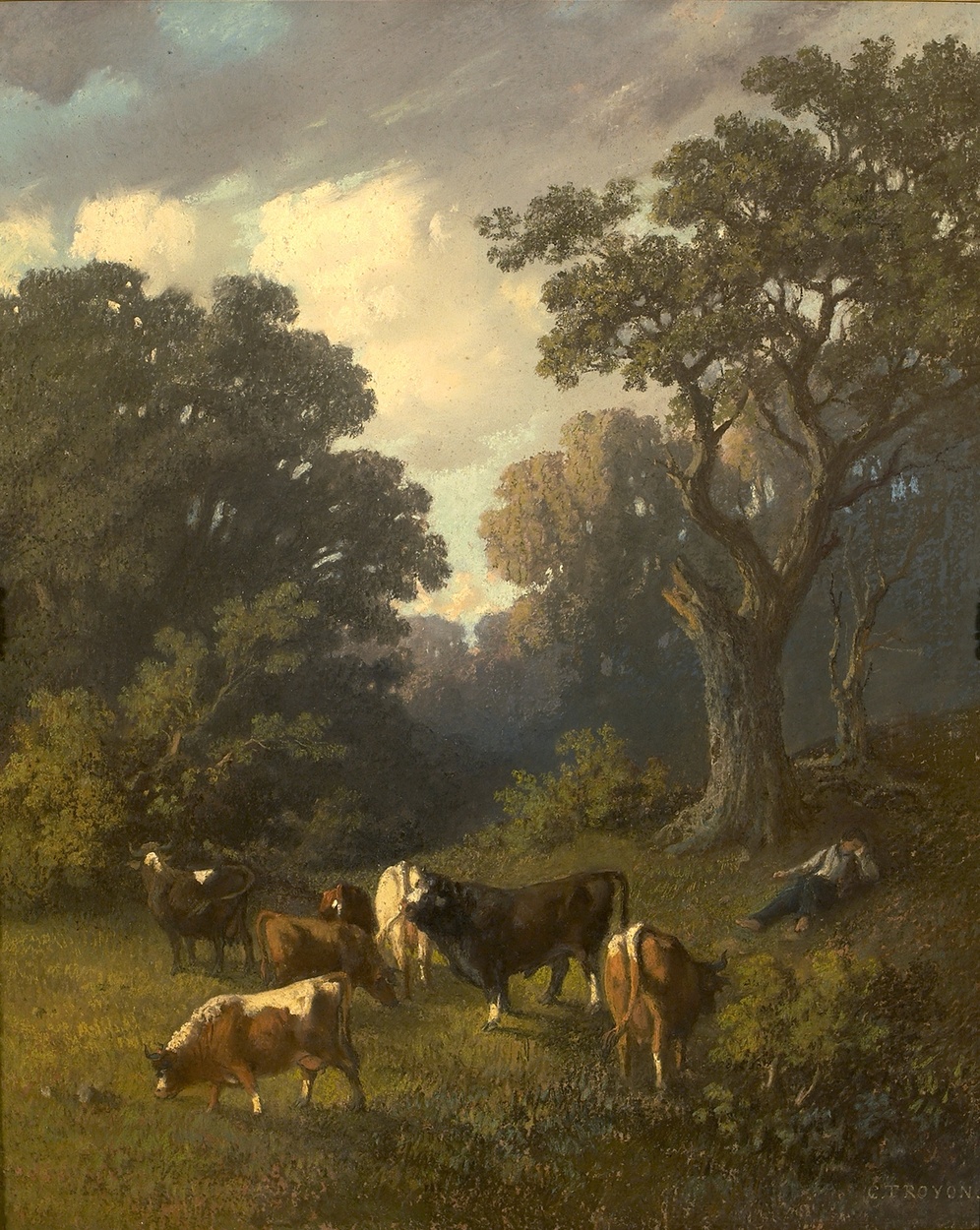 Constant Troyon was born August 28, 1810 in Sevres, where both of his parents were employed in The Sevres Porcelain Factory. He was trained by Riocreux, who was in charge of the porcelain museum at the Factory, and worked as a painter on porcelain. He drew and painted from nature in his spare time. In about 1824 he met Diaz, who became a closed friend. He made his debut at the Salon with three conventional landscapes and continued to work as a porcelain decorator. He painted in Sologne, in Brittany and with Jules Dupré in 1843, in the Landes. In the same year he met Rousseau and went to work in Barbizon, where he received his true introduction to landscape painting. Troyon exhibited views of the Forest of Fontainebleau at the Salons of 1844, 1846,and 1848. The decisive moment of his career came in 1847 during a visit to Holland, when he saw the work of Cuyp and Potter for the first time. He began to introduce domestic animals into his own pictures and became as a result a famous animal painter. He continued to paint landscapes, working mainly in Normandy, and the area of Tours, also visiting England and Tours and returning occasionally to the Barbizon region. In 1859 he advised the young Monet to work out of doors. He gained an international reputation via many exhibitions of his work, which were held in collections abroad, and he was swamped with commissions. In his last years he painted seascapes on the Normandy coast; it was during this period that Boudin worked for him. Constant Troyon died March 20, 1865 in Paris at the age of fifty-five.