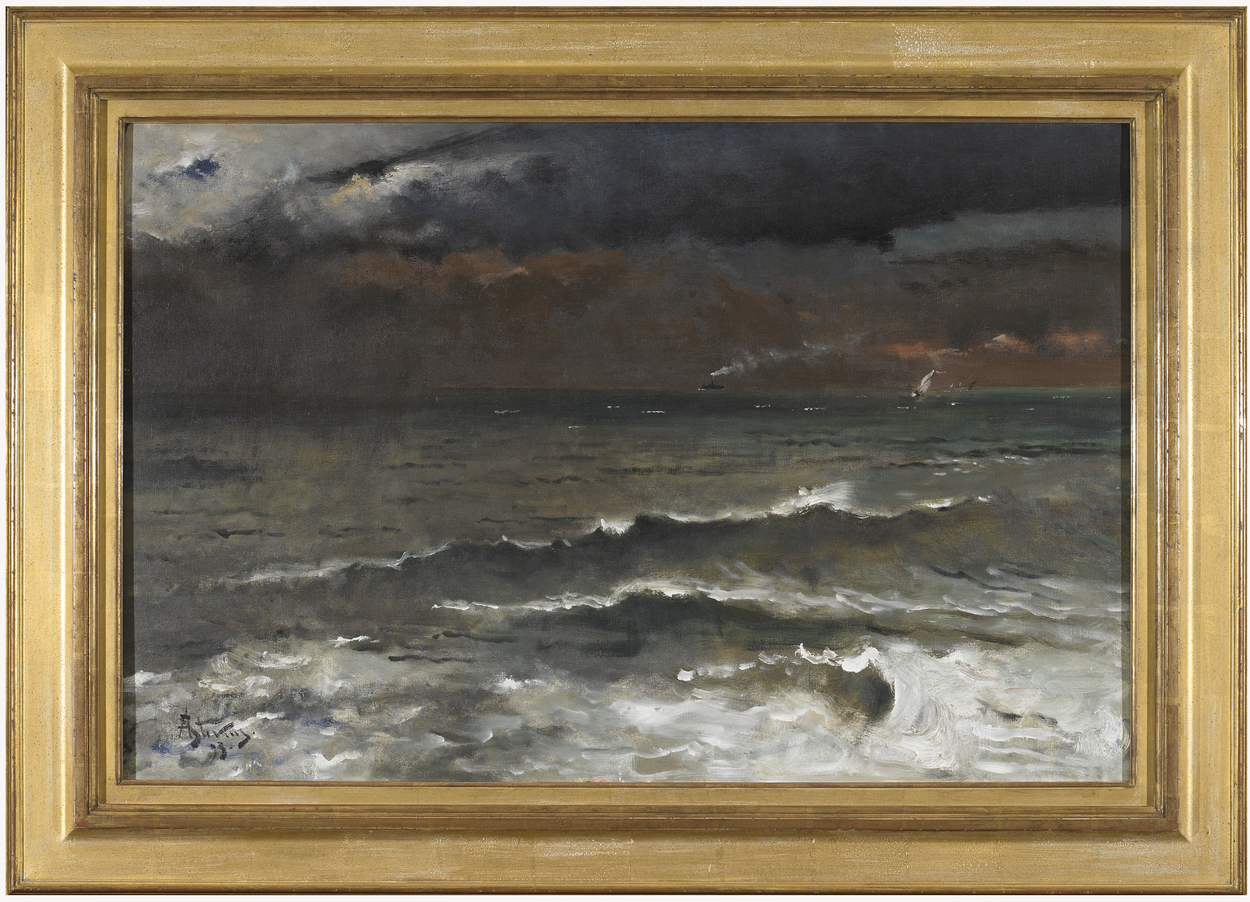 In 1880, on the advice of his doctor and close friend Professor Peter, Alfred Stevens began to spend time at the seaside to paint and to recover his health. With an annual stipend and exclusivity contract from Georges Petit, Stevens travelled to Le Havre from 1881-1883 and created numerous views of tumultuous seas below stormy skies. This began a new motif in Steven’s work that continued through the 1890s. He painted in Sainte-Adresse in 1884 and in Normandy in 1890, including Honfleur in 1891-92 and around Dieppe in 1893. It is this latter location is likely depicted in the current work.