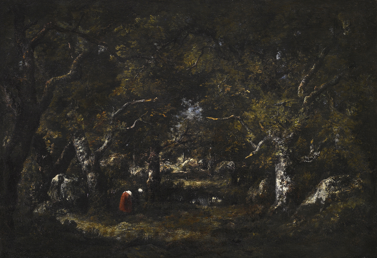 Though figure painting would always remain important for Diaz, it is his landscapes of the 1850s, 60s, and 70s, particularly those of Fontainebleau Forest, for which the artist is most remembered. Diaz met Theodore Rousseau in 1837 and showed his first Fontainebleau landscape at the Salon of that year. He began to exhibit pure landscapes without figures only after 1848, and the success of these forest interior scenes, including one which won him a first class medal at the Salon of 1848, allowed him to discontinue exhibiting publicly at the Salon after 1859. Recognized as a superb colorist in his own day, his forest interiors are richly painted with warm browns, oranges, golds and silvery tree trunks and branches. Though the artist often applied paint loosely with a broad palette knife, his acute observation of nature and natural effects was nevertheless keen. He was officially decorated even after leaving the official exhibition system when he received the Legion d’honneur in 1881. Diaz’s financial success enabled him to lend a helping hand to his friends when in need, including Troyon, Rousseau, and Millet.